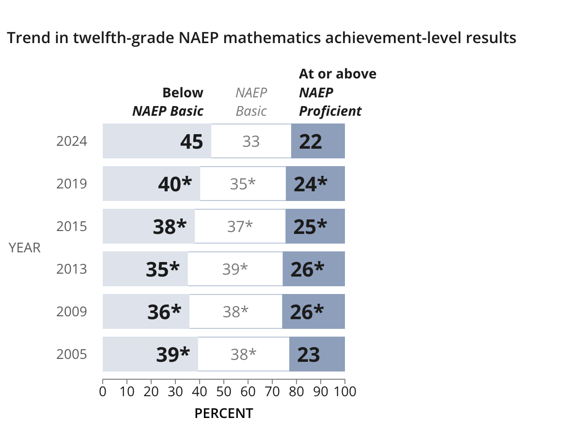From NAEP: “In 2024, the average mathematics score for the nation at grade 12 was 3 points lower than in 2019. Compared to the mathematics assessment in 2005, the average score was 3 points lower in 2024. NAEP scores are also reported at five selected percentiles to show score trends by lower- (10th and 25th percentiles), middle- (50th percentile), and higher- (75th and 90th percentiles) performing students. Compared to 2019, scores were lower at all of the selected percentiles except for the 90th percentile.”